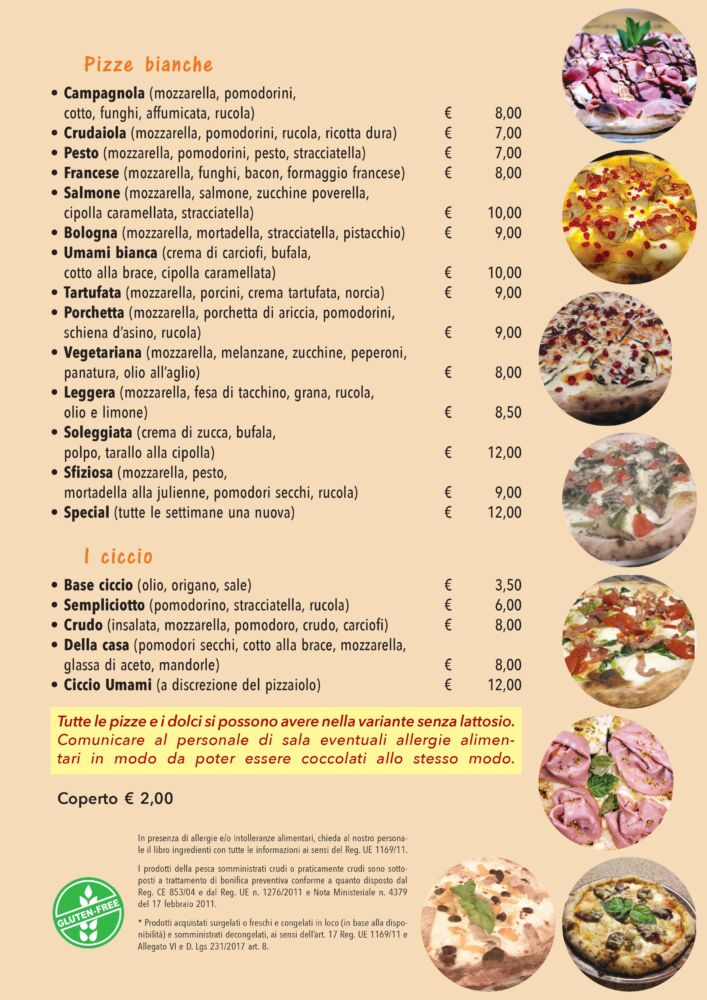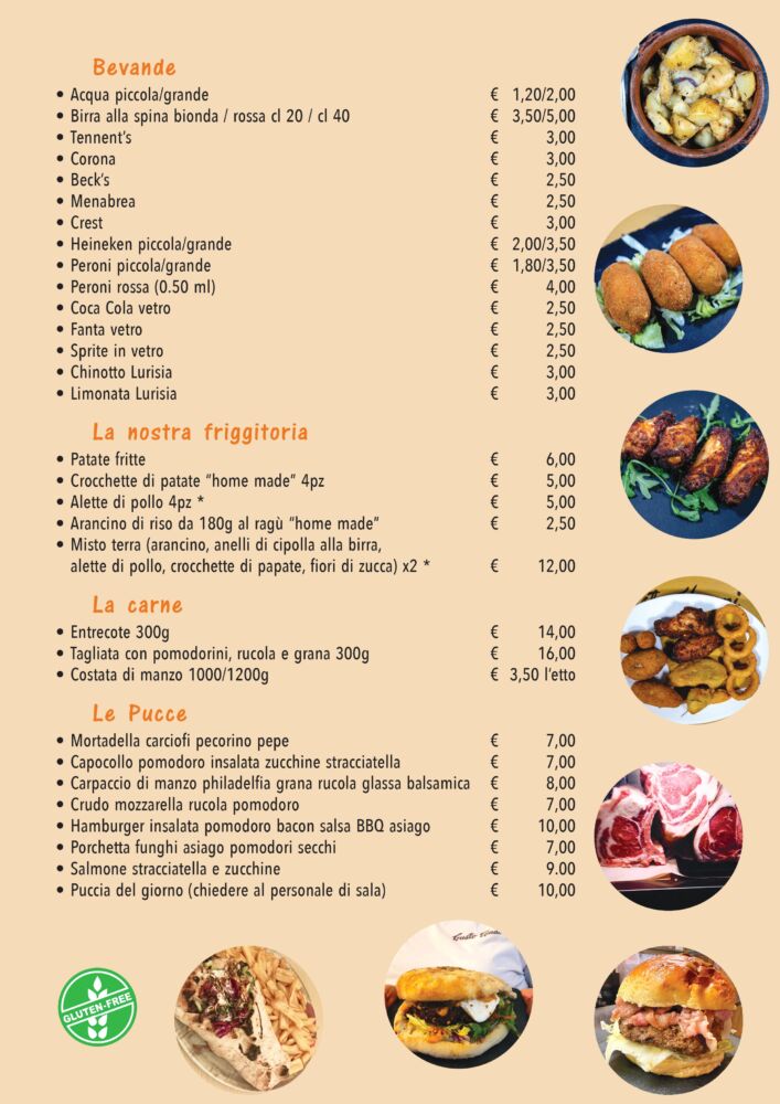 Friggitoria, antipasti, carne, pucce, pizze classiche, pizze rosse e pizze bianche, i ciccio, e tanta scelta tra dolci e bevande. Spesso il titolare, il sig. Vito, realizza dei menu personalizzati con un prezzo fisso a persona con tutte le specialità del momento. Tutte le pizze possono essere senza glutine e senza lattosio, ma sempre con tutto il gusto di una pizza fatta ad arte. Anche i dolci si possono avere nella variante senza lattosio (si raccomanda sempre di comunicare al personale di sala eventuali allergie). Le bontà proposte nel menu sono accompagnate da un servizio caloroso e professionale, per vivere al meglio un’esperienza di vera qualità.